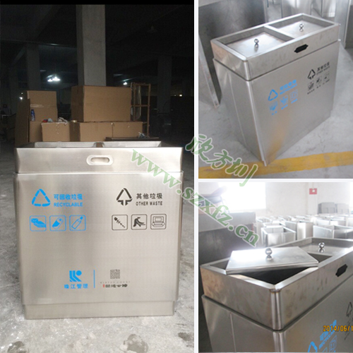 這批C185分類環(huán)保垃圾桶是采用304#優(yōu)質(zhì)不銹鋼材料模壓成型,厚度足1.2mm,里面配置了厚度為0.4mm的鍍鋅板內(nèi)桶,堅固耐用,不易破損。垃圾桶外觀為方形,閃爍著金屬的亮澤,高雅美觀,在制作方面也有精良的做工,注重細節(jié)的處理,做到無利口,不傷手! 桶身雙分類,正面絲印有“不可回收”和“其他垃圾”的分類標志,具有耐火安全,抗高低溫,適合各種惡劣氣候條件,再加上產(chǎn)品表面光滑,亮麗廣泛適用于各種場所,是電梯口、寫字樓、學校、物業(yè)、賓館、酒店、機場、汽車站等擺放場地的首選。