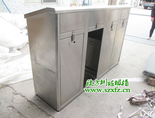 深圳師范學(xué)院附屬中學(xué)款式的C170五分類環(huán)?;厥障?/span>規(guī)格為:1600*400*860mm.外表是一款全新不銹鋼材質(zhì)打造而成.不銹鋼垃圾桶頂部有五個(gè)垃圾投放組合,圓形垃圾投口分別左,右,中間,還有兩個(gè)半圓在中間部位。不銹鋼垃圾桶正面開有五個(gè)門,每一個(gè)門前都有一個(gè)小鑰匙配套開門。正面中間橫幅有LOGO的標(biāo)準(zhǔn),還有深圳大學(xué)師范學(xué)院附屬中學(xué)字樣及英文拼音字母組合而成。不銹鋼垃圾桶五個(gè)取放垃圾內(nèi)膽正門,絲印有五個(gè)垃圾投放標(biāo)志。從左到右依次回收塑料罐,金屬罐,利樂(lè)包,紙張,有害垃圾及標(biāo)志。不銹鋼垃圾桶外觀為方形,具有獨(dú)特的堅(jiān)固耐用,不易破損;耐火安全,抗高低溫等優(yōu)勢(shì)。適合各大院校,高檔場(chǎng)所使用。