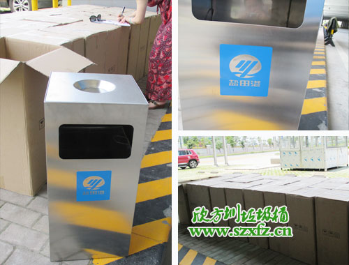 本款不銹鋼垃圾桶是按照貴司的常規(guī)熱銷款C60方形不銹鋼果皮箱改造而來(lái)的,其規(guī)格為:350*350*680mm。不銹鋼垃圾桶外觀不銹鋼色澤,常規(guī)不銹鋼垃圾桶桶部上面絲印有禁煙標(biāo)志,按照顧客的要求改造為桶上方凹圓形槽,用于裝置煙灰頭。不銹鋼垃圾桶桶的正面,旁邊用藍(lán)色搭配絲印,鹽田港三個(gè)字及LOGO跟不銹鋼垃圾桶色澤一致,金屬亮澤 ,高雅美觀。