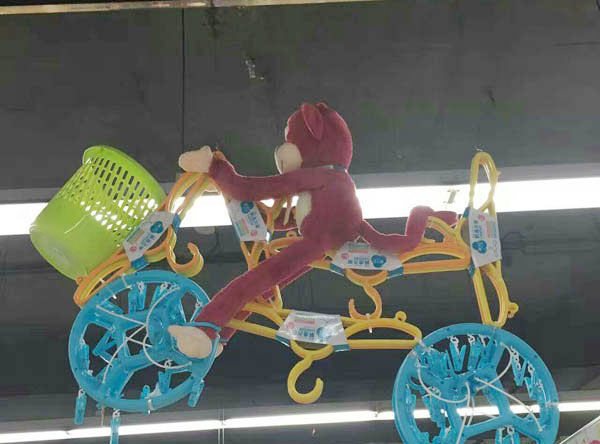 在這家超市的日用品售賣區(qū),“猴兒騎自行車”掛在頂棚處,兩個(gè)衣架為車輪,若干個(gè)衣掛組成扶手、橫梁、車座,垃圾桶則恰到好處地在車前成為車筐。整個(gè)造型創(chuàng)意十足、形象逼真、顏色鮮艷、熱鬧有趣,很多逛超市的市民看到了都感嘆“太有才啦!”。
