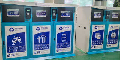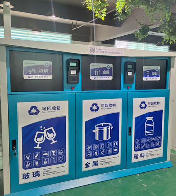 深圳校園智能分類垃圾箱由有害垃圾、玻璃、金屬、塑料、紙張、其他垃圾、廚余垃圾組成。兩側設有滿載感應器,當回收箱滿載時,相應警示燈亮起,投放口...