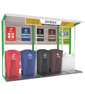 設有擋雨棚,可配備垃圾箱信息顯示屏、防水照明燈、廣告屏,進行地面硬化。對社區(qū)玻金塑紙可回收物,其他垃圾,廚余垃圾,有害垃圾等生活垃圾定時定點投放收集.
